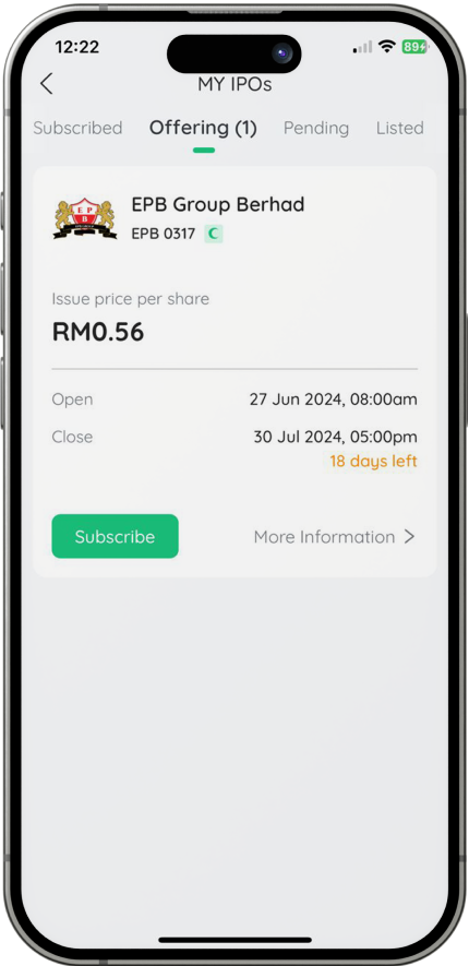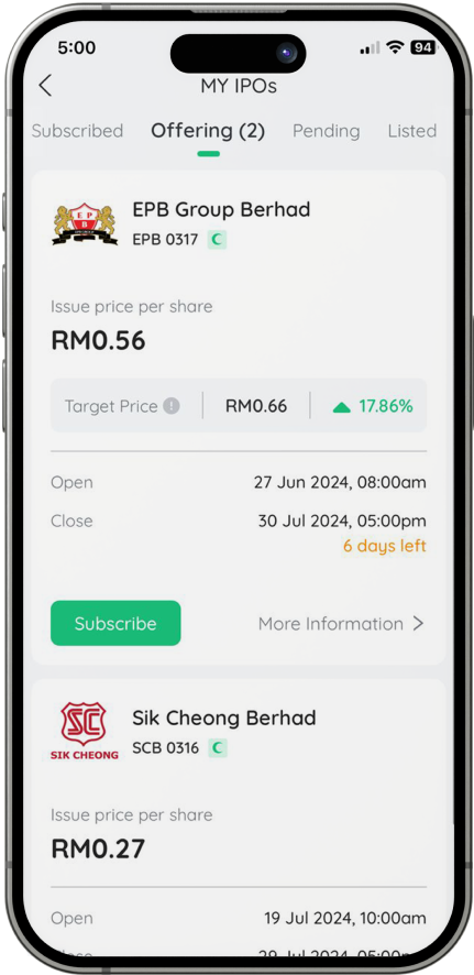 Subscribe to IPOs easily and directly in just a few simple taps.